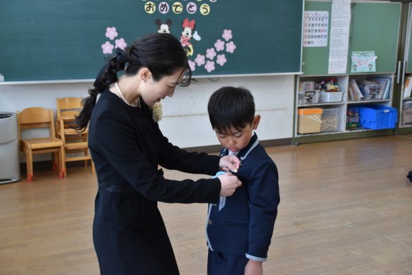登園してきた子から、担任の先生に『しゅうりょうおめでとう』のリボンを胸に付けてもらいましたよ🎀見慣れないリボンにみんな興味津々で、付けてもらっている間、リボンをじーっと見ている姿が可愛らしかったです♡