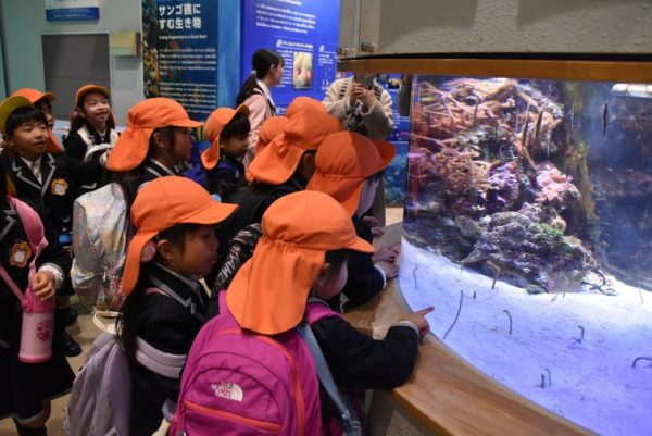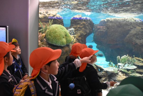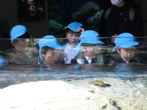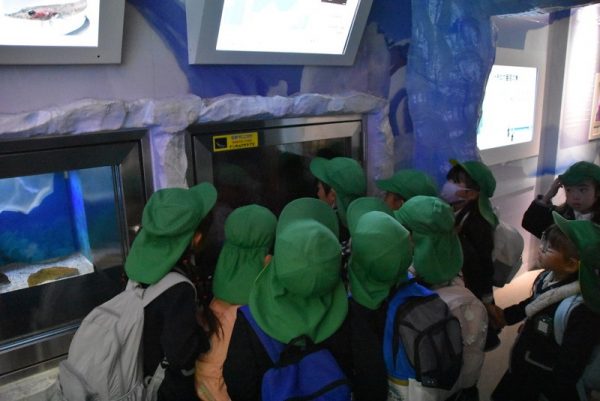 指差しをしながら「あれ見て!大きいカニがいる!」「ウミガメが泳いでいるよ!」と、友だちと一緒にいろいろな生き物を見て、大興奮な子どもたちでした🎵みんなで集まって、ギュウギュウになりながら生き物を見ている子どもたちの姿が可愛かったです♡