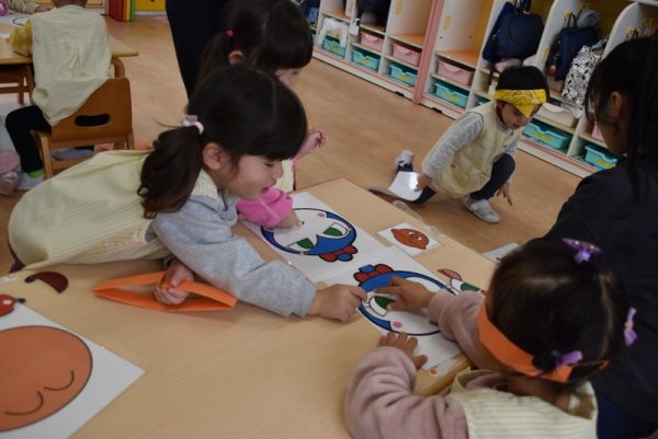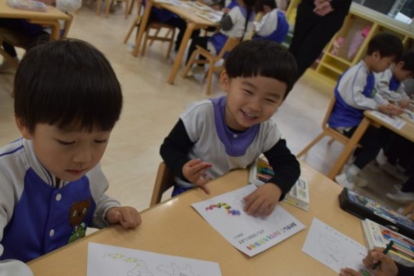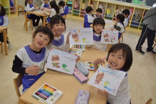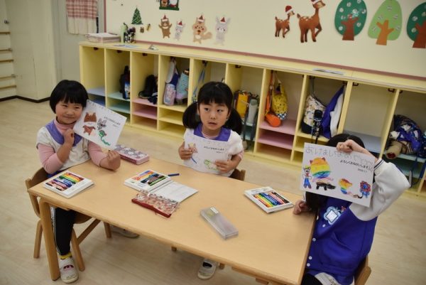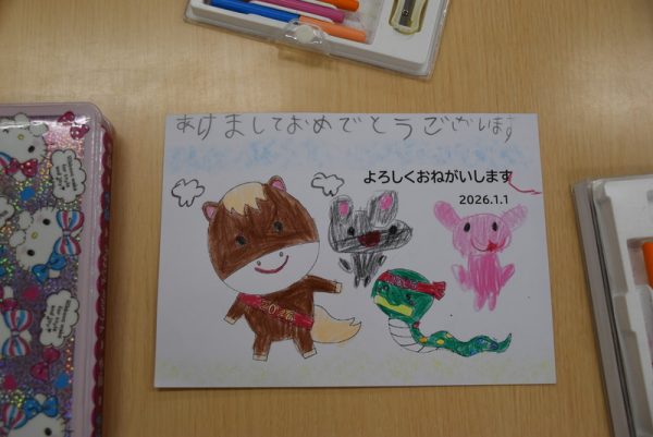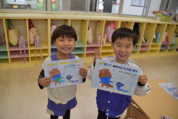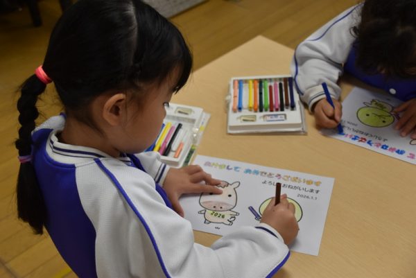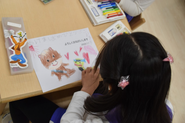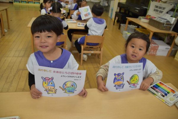 一方、3歳児以上のどんぐりさんのお部屋では、年賀状つくりを行っていました。