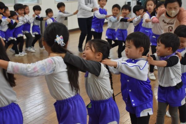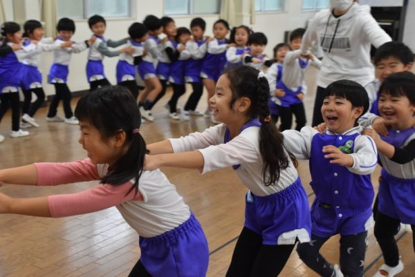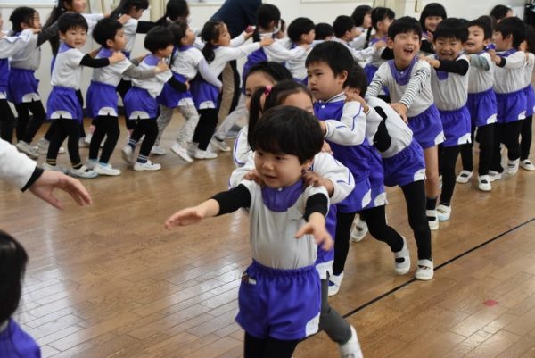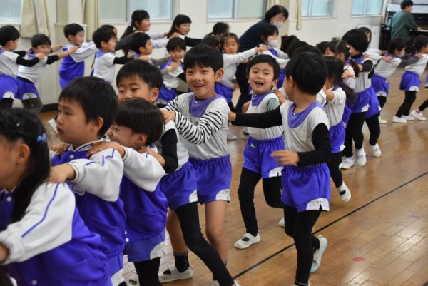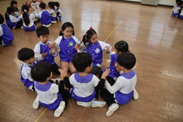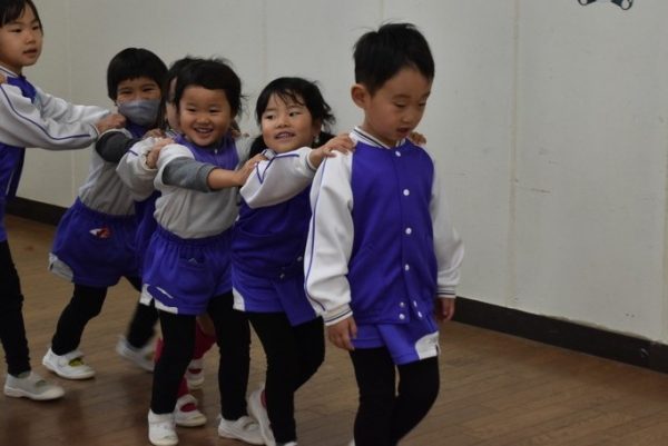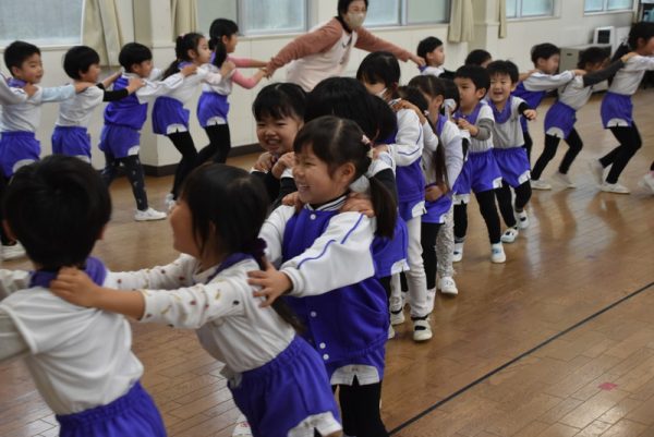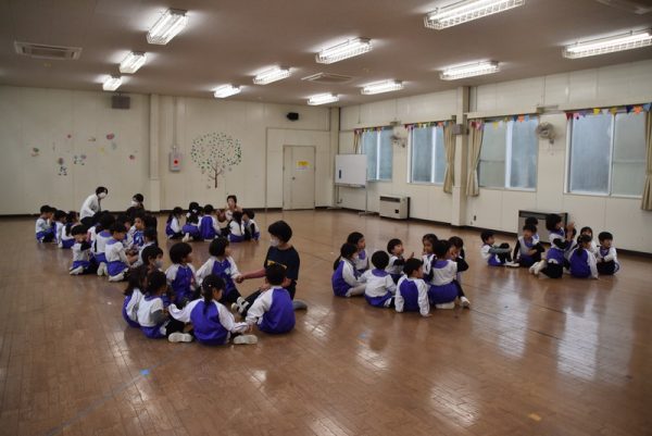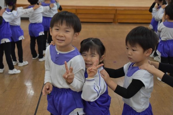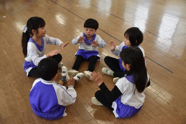 他の学年のお友だちと一緒に、ホールに集まり、ほかの学年の子たちと一緒にふれあい遊びを楽しみましたよ。