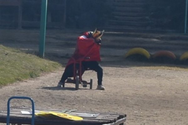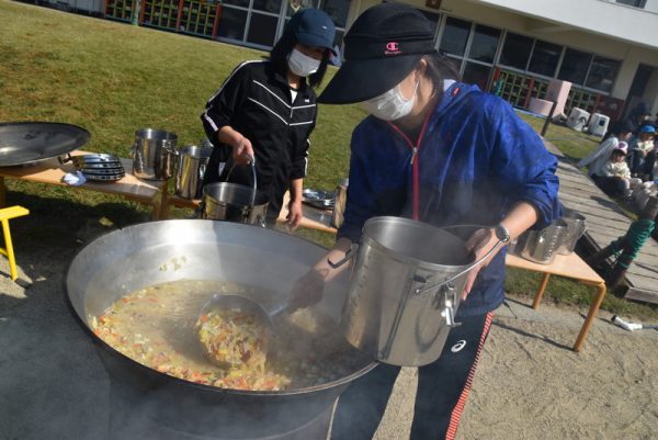 園庭の端っこで大鍋の番をしてくれています。この中にはみんなのさつま汁が・・・♡おいしくなぁれと願いを込めながらコトコト煮込んでくださっています♪
