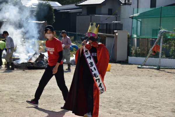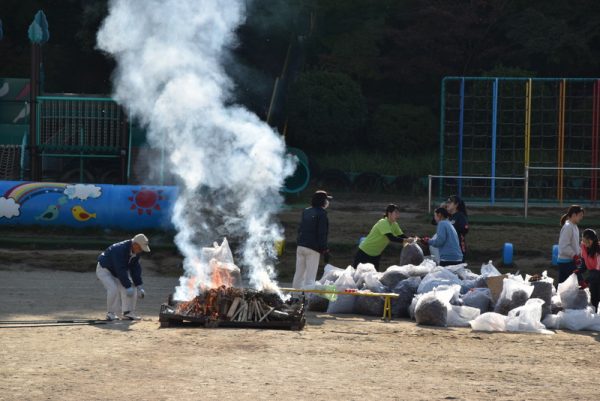 みんなが登園してくるとすでにこんなに煙が!!朝から、環境整備の先生方が中心となって職員室の先生も一緒に芋を焼く準備です!!