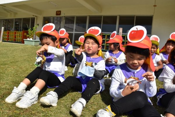 秋晴れのとってもいいお天気に恵まれ、津西幼稚園の全園児が集まって収穫祭を行いました。保護者の皆様にもご協力いただき、落ち葉や木の枝などをたくさん集め、その中でさつまいもを焼きました!!
