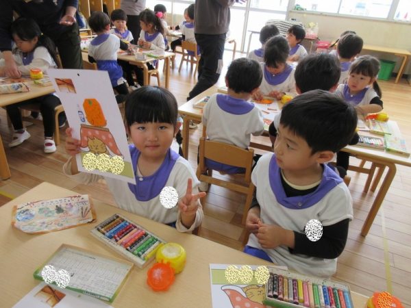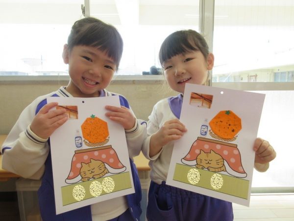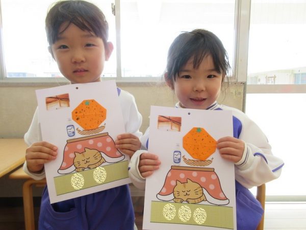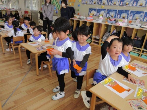 3学期が始まり、早2週間。気持ち新たに3学期の当番表作りをしました。今学期の題材は、『冬』。冬と言えば、『こたつにみかん』。と、いうことで、折り紙でみかんを折りました。🍊指先を器用に扱えるようになった成長が感じられる製作遊びになりました。