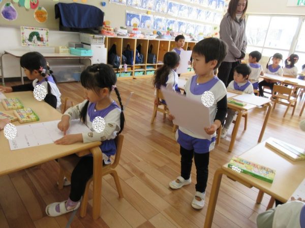 当番の子が、名前を読んで配ってくれています。文字に興味を持ち始め、読める文字が増えてきましたね。