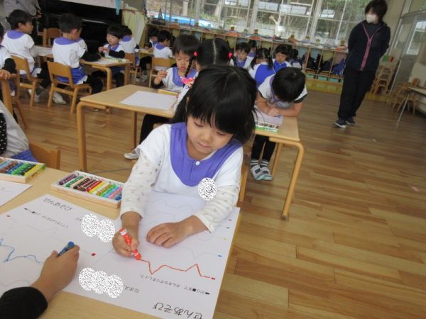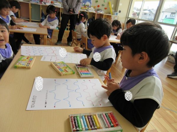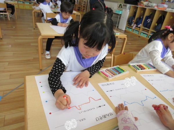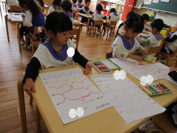 線遊びにも挑戦しましたよ。年中になると、鉛筆を使って文字を書く活動が始まります。年少児は、文字遊びや運筆の導入として、この1年間、様々な形で線遊びを取り入れてきました。直線、曲線、凸凹線と、回数を重ねることで、細かい部分の運筆も上手になってきています。年中になって、鉛筆が持てることを楽しみにしている子どもたちです。