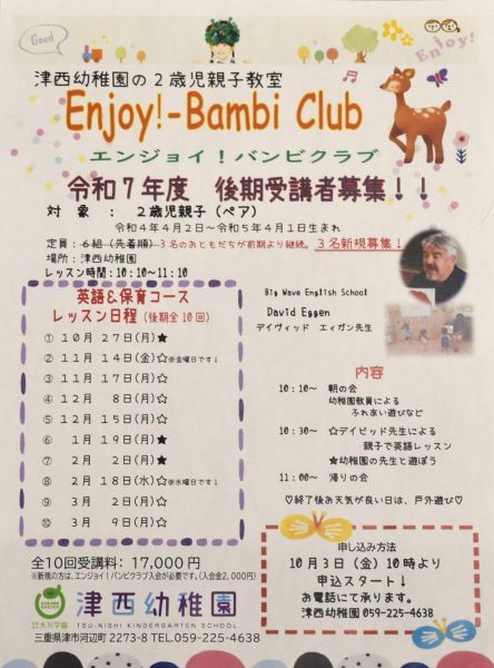 津西幼稚園 2歳児親子教室 Enjoy!-Bambi Clubの後期の募集が始まります。