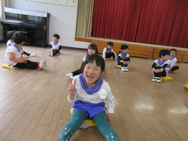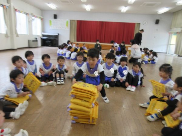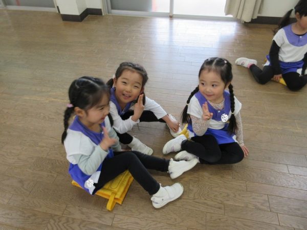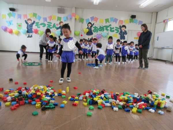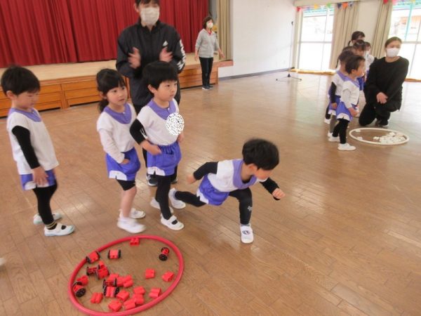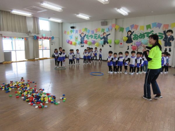 お部屋のブロックを使ったゲームも楽しみました。4つのグループに分かれて指示された色のブロックを自分たちのフープに入れるリレー形式です。『順番を待つ』『終わったら後ろに並ぶ』この約束をしっかりと守れましたよ。