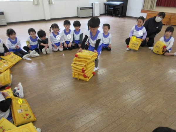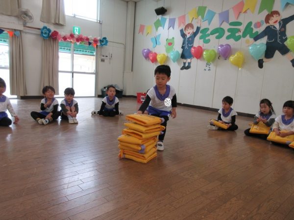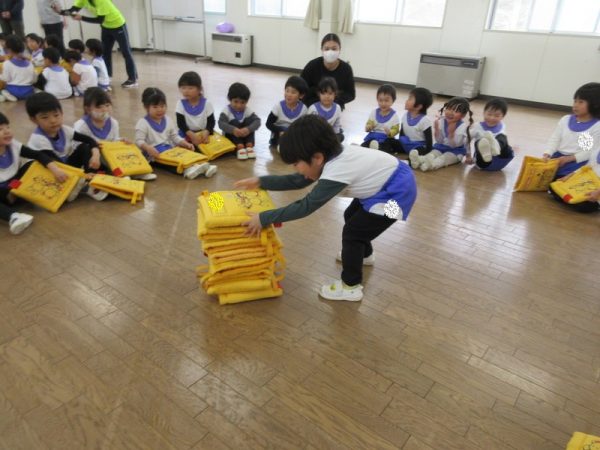 次は、座布団積み上げ競争です。どちらのクラスが高く積み上げられるか競い合いました。