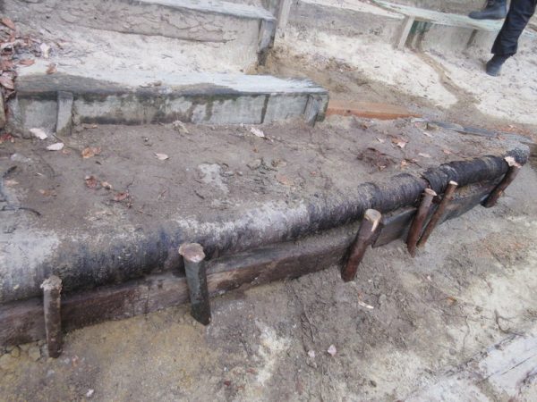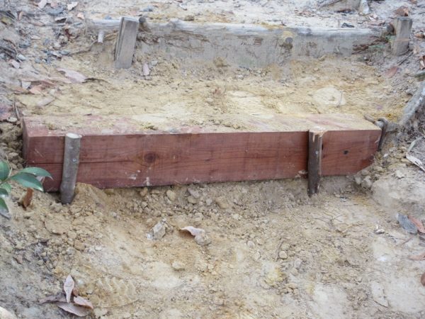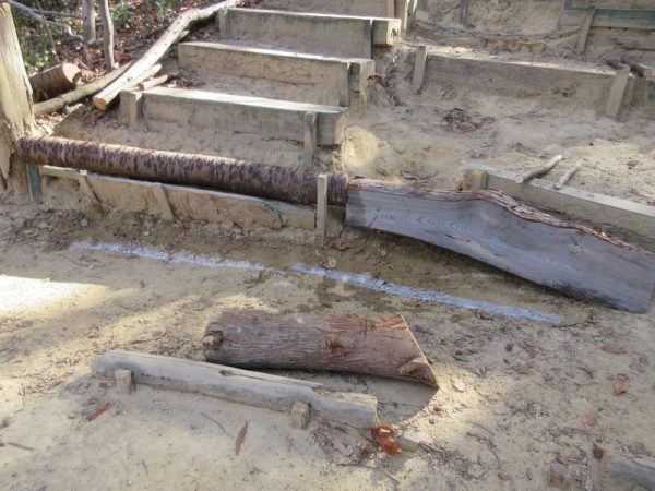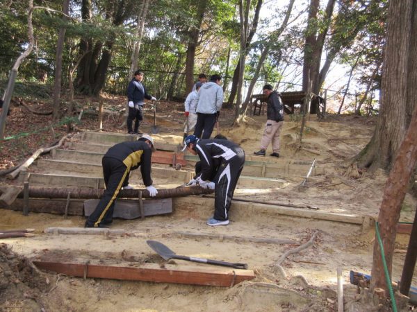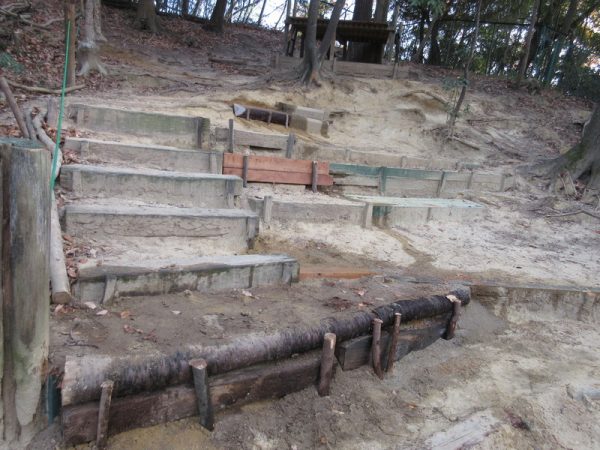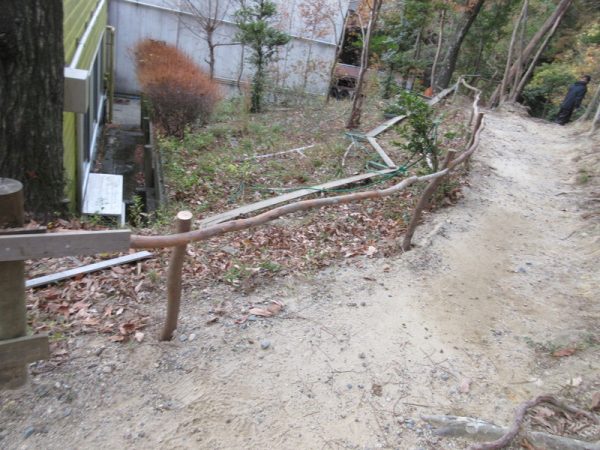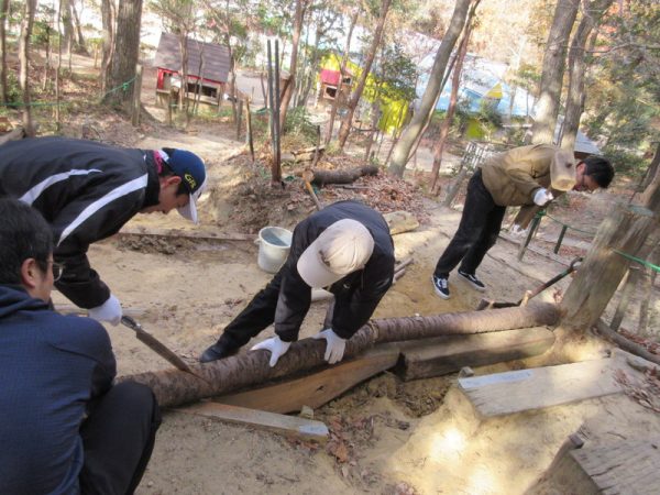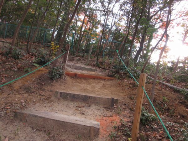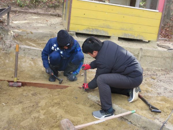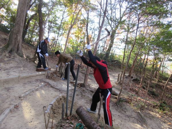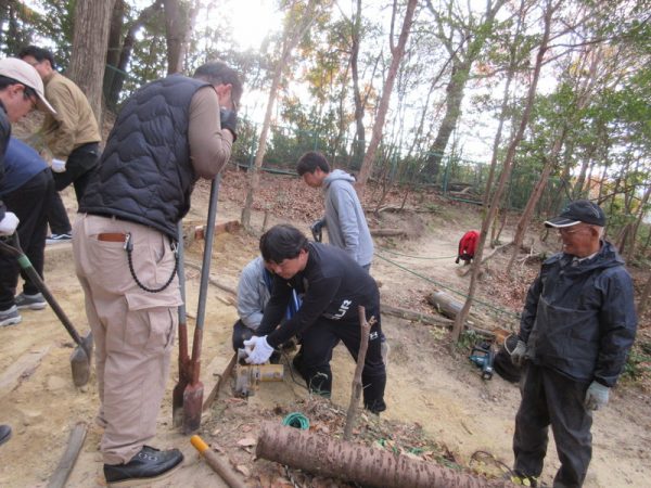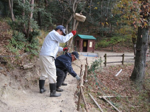 段差が大きくなってしまった所や木の根っこがあらわになり子どもたちがひっかかってしまいそうな所に土を盛り、階段になる木を設置して、杭でとめていくという地道な作業です。