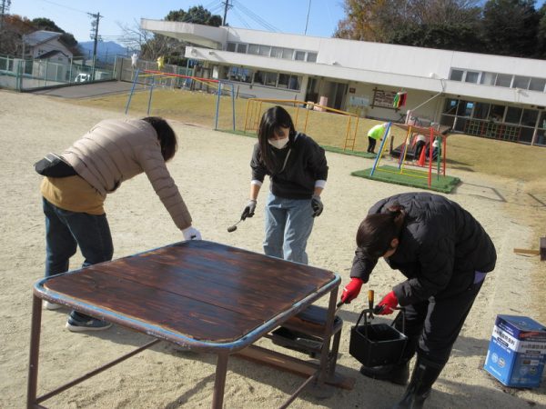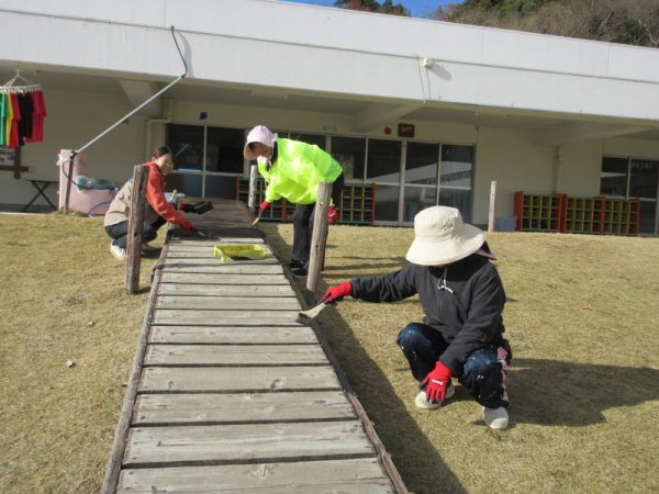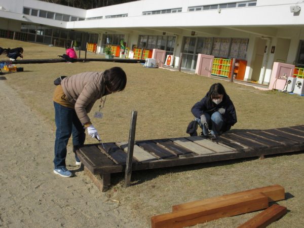 お母さま方には、まず、園庭内で木材を使用しているところに、防腐剤を塗っていただきました。
