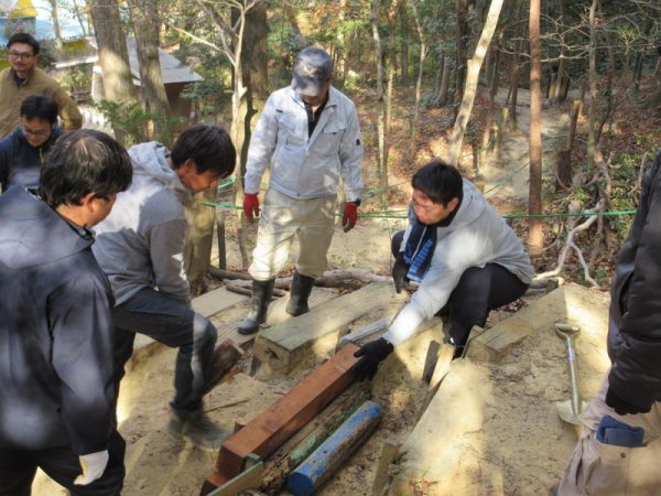 この日のお山隊のプロジェクトは、2つあり、1つ目はゲリラ豪雨が多い昨今、その際の鉄砲水の影響で削れてしまった山の階段の修繕作業でした。