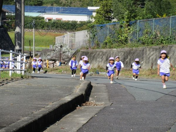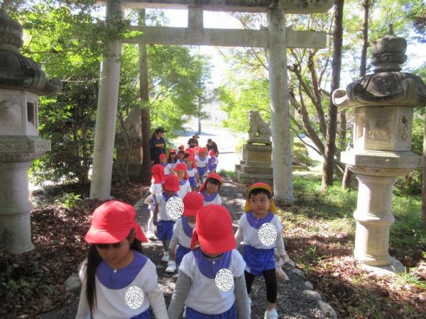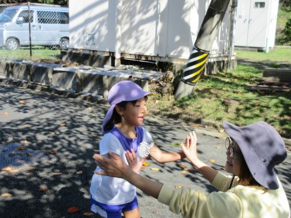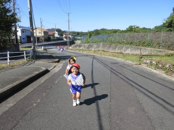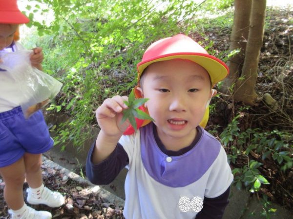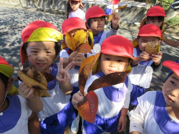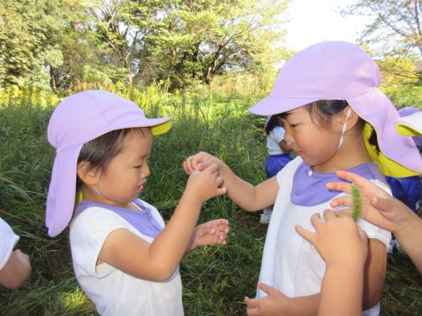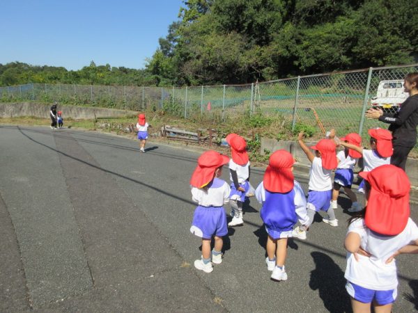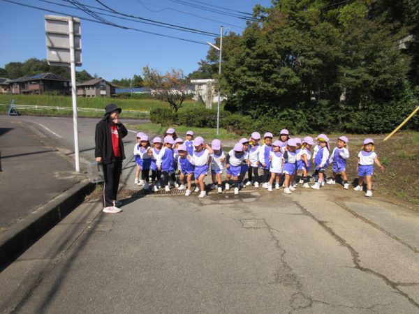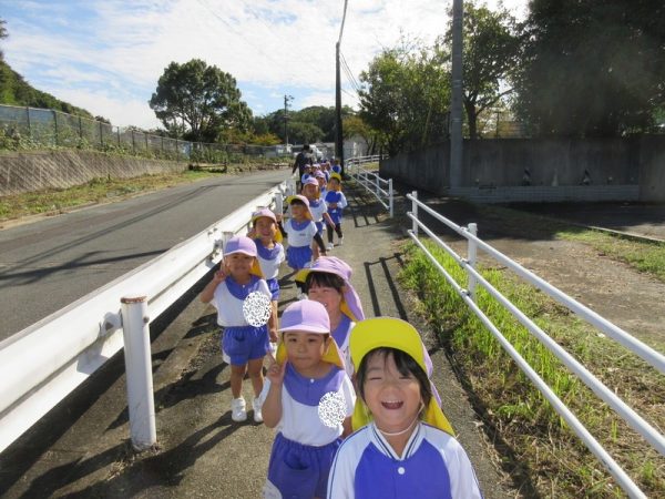 水曜日に予定していた散歩でしたが、雨だったので、お楽しみは木曜日に持ち越しになりました。「今日はお散歩に行こうね。」と、話をすると、「ヤッター!!」と、大喜びの子どもたちでしたよ。お友だちと一緒に手をつなぎ出発!!幼稚園近くの坂道を歩いたり、秋の虫探しを楽しんだりしました。運動会を経験し、友だちとのつながりが深まりつつある今、ぎゅっと手をつないで歩くだけでも楽しい!嬉しい!そんな、ワクワク感が伝わってくる一日になりましたね。