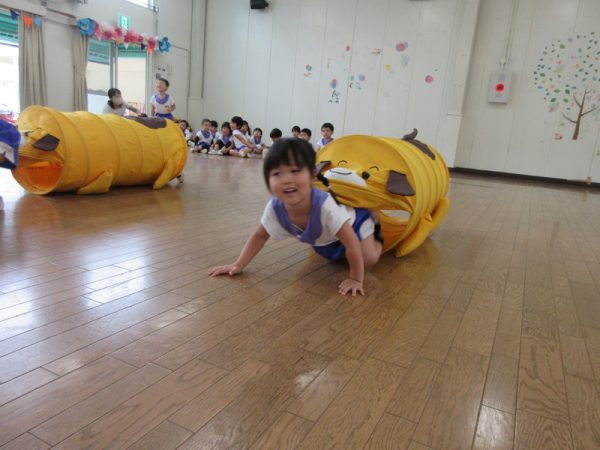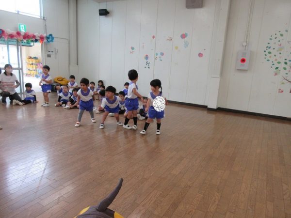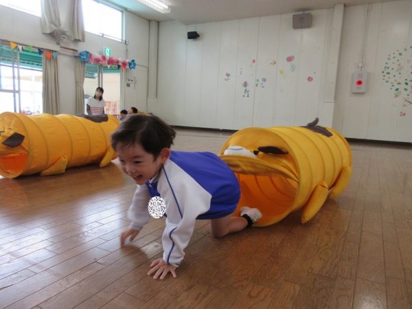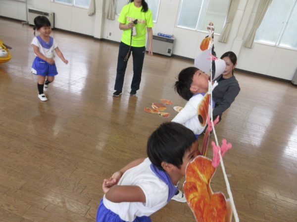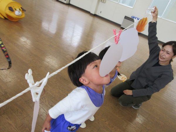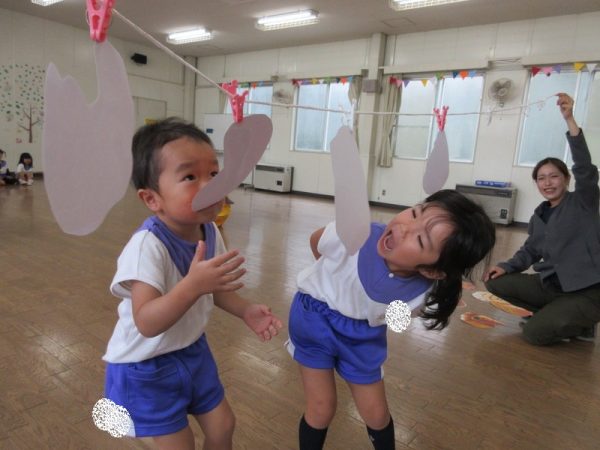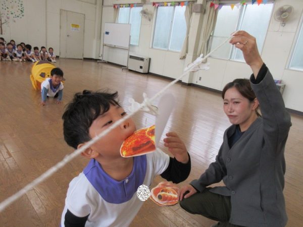 そして、今日は、運動会ごっこの余韻に浸りながらの、また、違った楽しい競技を楽しみました。来入園児の小さいお友だちがやっていた競技を少しだけ高度にした内容の遊びです。大きな、そして、おいしそうなパンを使って、「パン食い競争」をして遊びましたよ。