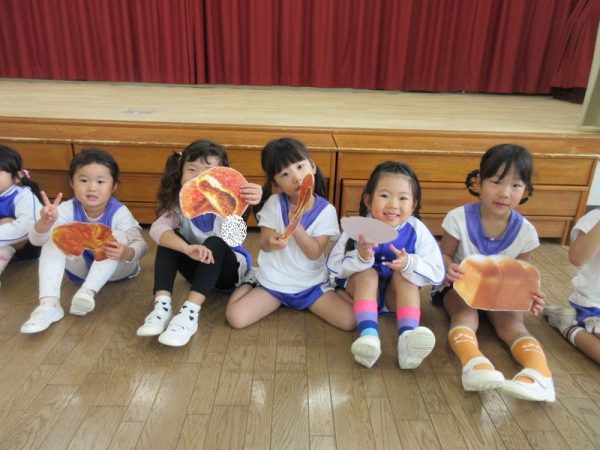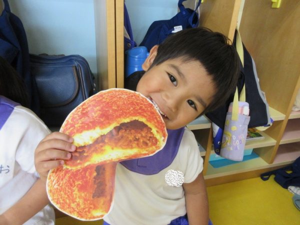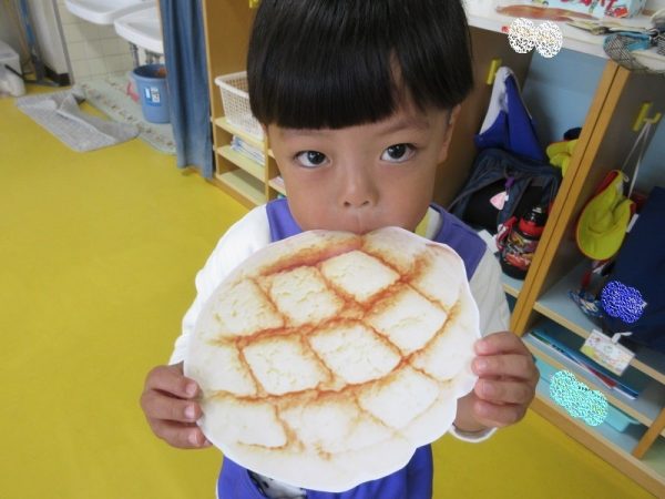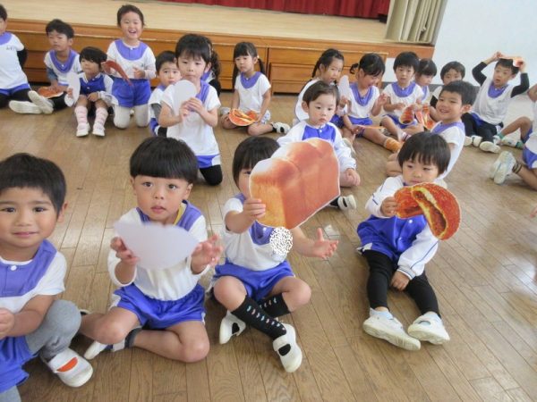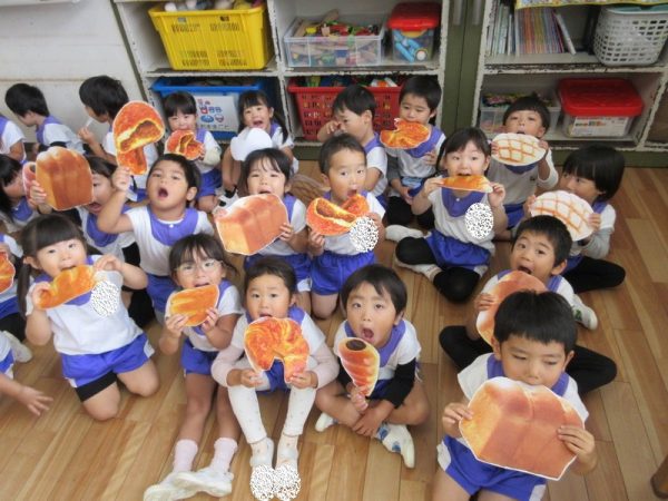 「手を使わないように頑張ってね。」というお約束をしっかりと守って楽しむことができましたね。今頃、お家で大きなパンを見ながら、楽しいお話をしてくれていることでしょうね。