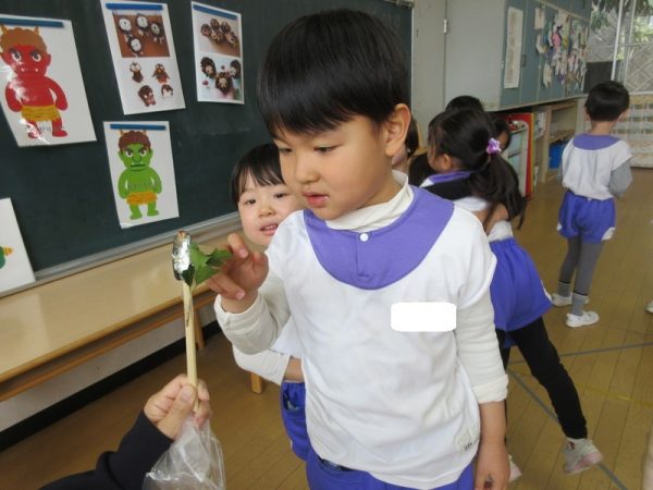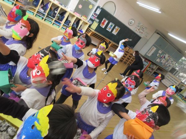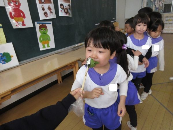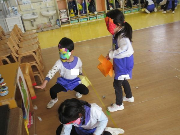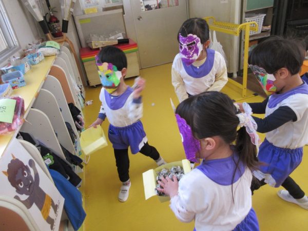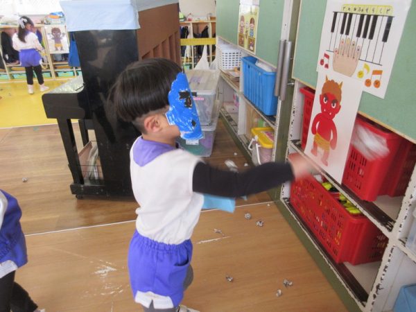 「夜は、恵方巻食べるんだよ!」「南南東なんだって!」と難しい言葉も覚えられるようになった年中さん。お家での節分も楽しみにしている様子でした。