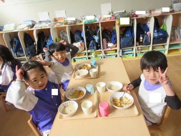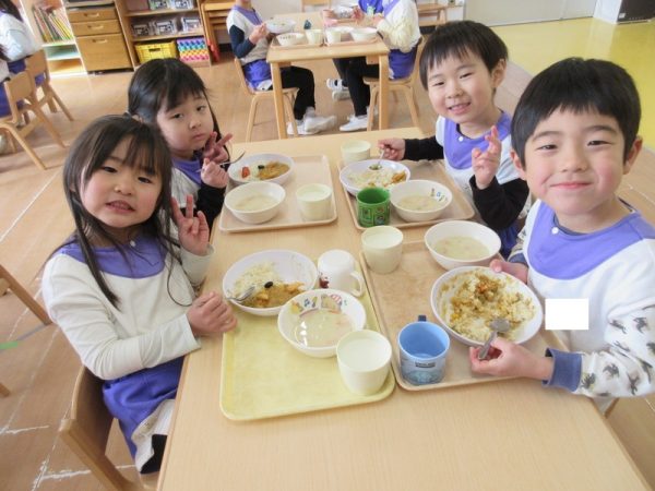 給食には鬼っ子カレーライスを食べました。美味しいカレーでみんなニッコニコ♡