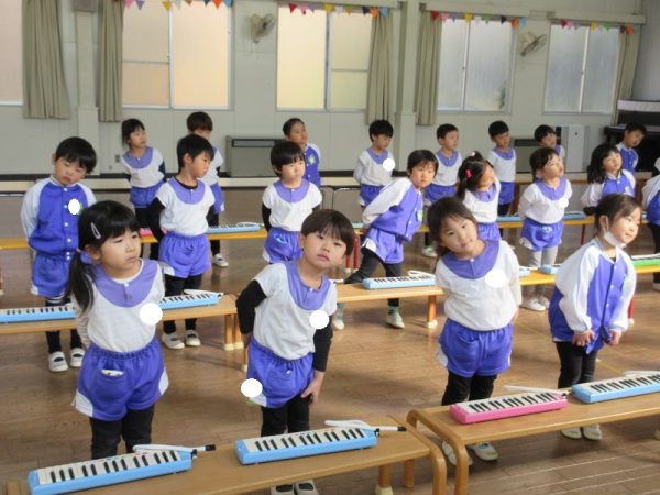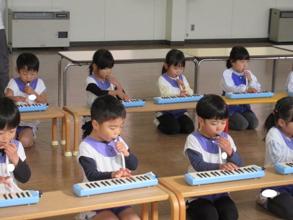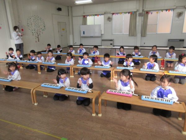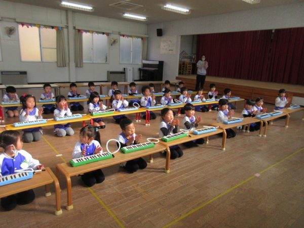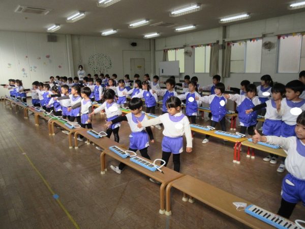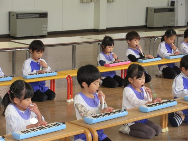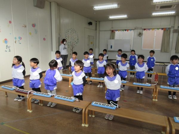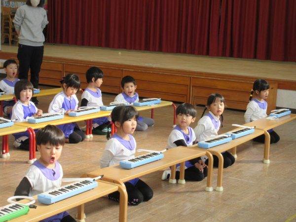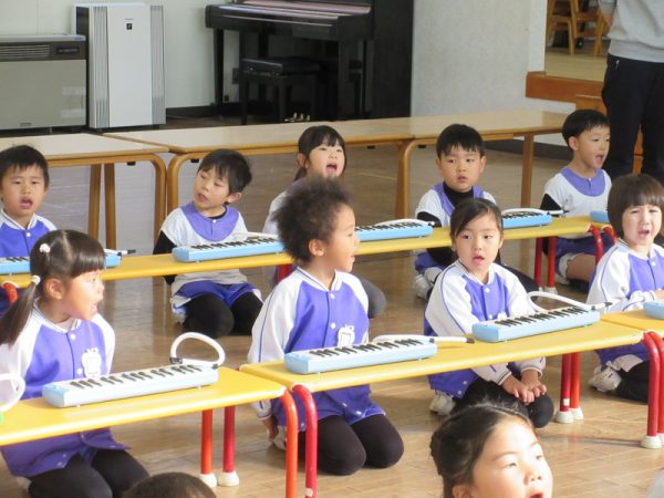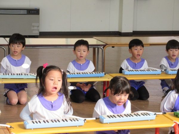 年中さんは、鍵盤ハーモニカ&斉唱も披露しますので、練習風景を紹介しますね!