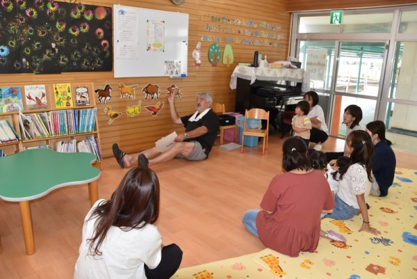 全10回の前期の講座で、デイビット先生の英語のレッスンだけでなく、幼稚園の園庭や保育室で遊んだり、ミニ幼稚園ごっことして、朝の会や帰りの会、絵画制作や運動遊び、ゲーム遊びを経験したりと、いろんな活動を楽しんできました。