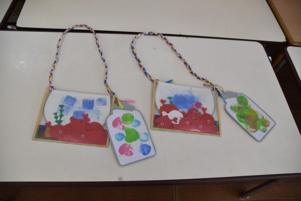 前回スタンプ遊びをした水槽を、ちか先生が金魚を集めるためのバックに変身させてくれていましたよ。
