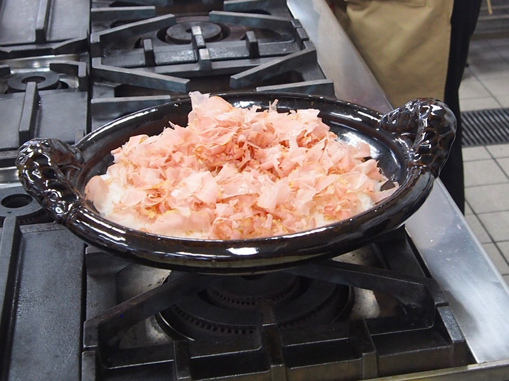 土鍋で炊くご飯の上に、香り豊かなかつお節をふんだんに振りかけられ、