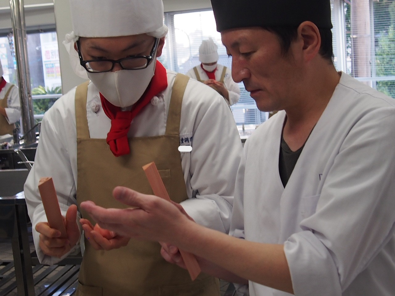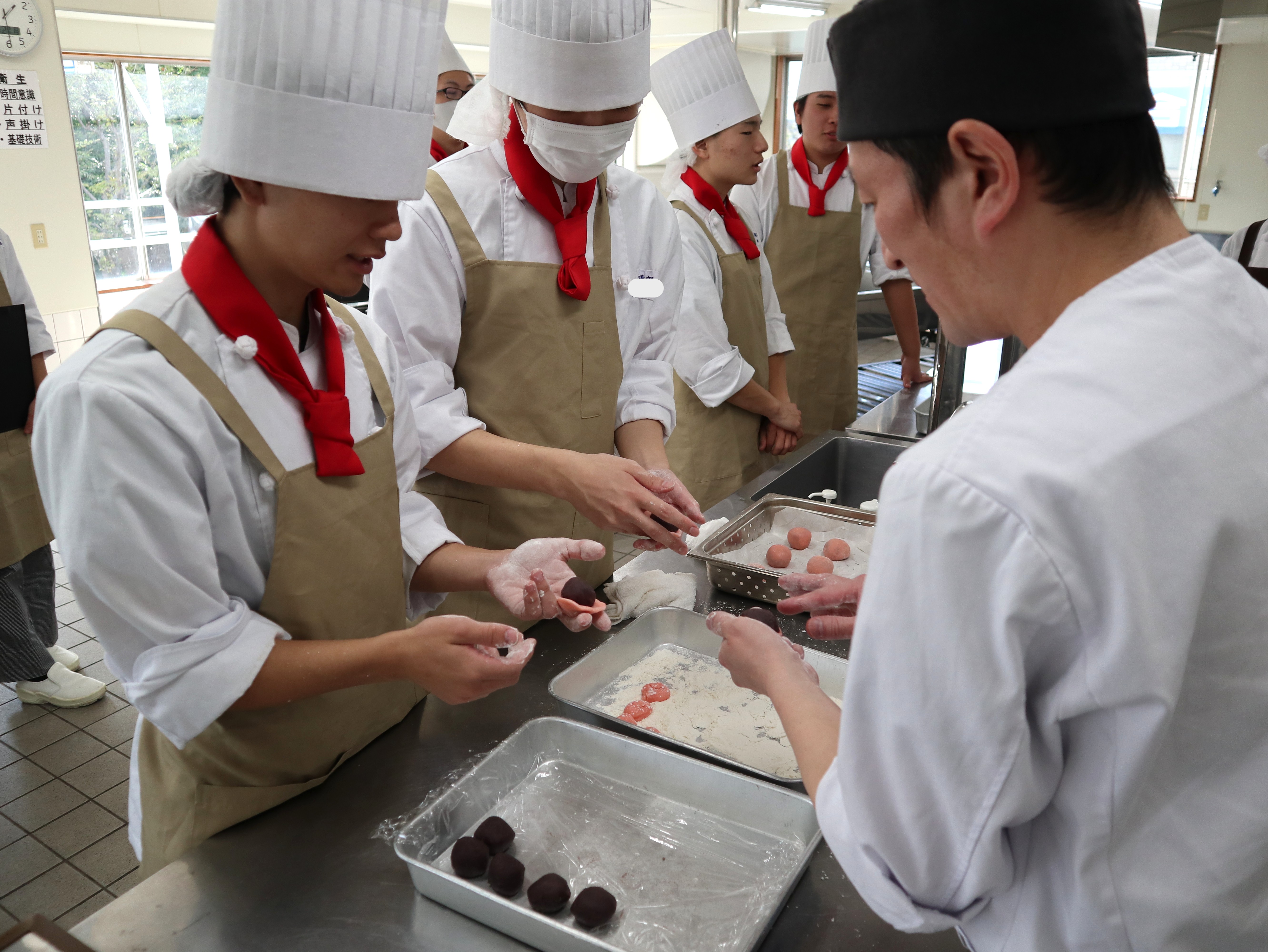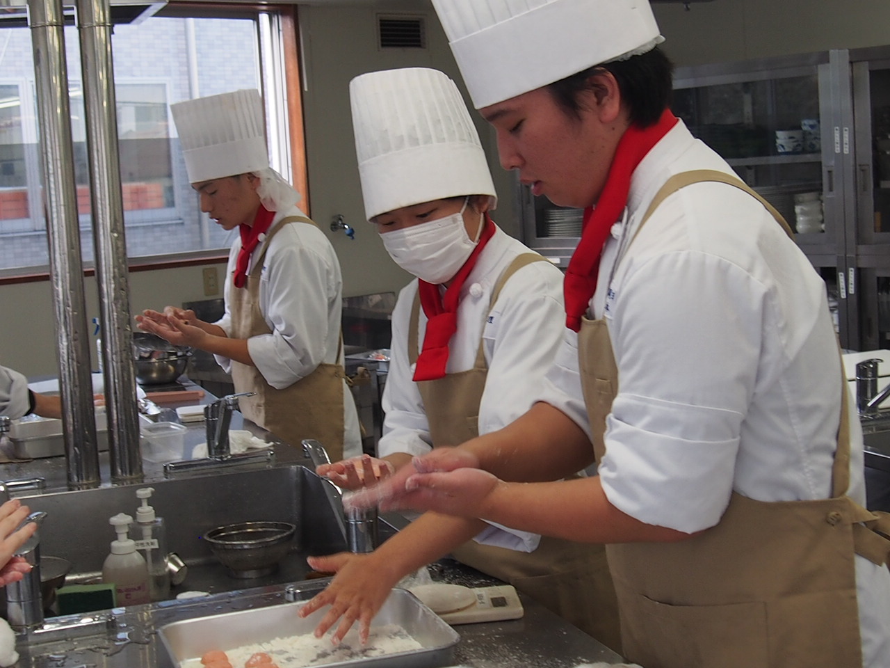 和菓子実習② 午後からは小麦饅頭・練り切りを教わりました。 夏に和菓子の授業を受けていることもあって、学生は少し手慣れた様子。 練り切りは秋を感じる「ジャック・オー・ランタン」「秋桜」に挑戦! 包餡、着色、仕上げのポイントを先生からレクチャーを受け 学生も素敵な作品が出来上がりました♪ 世界からも注目される和菓子!! 食べ物の業界に携わる学生には 日本の素晴らしさを発信してほしいと思います。