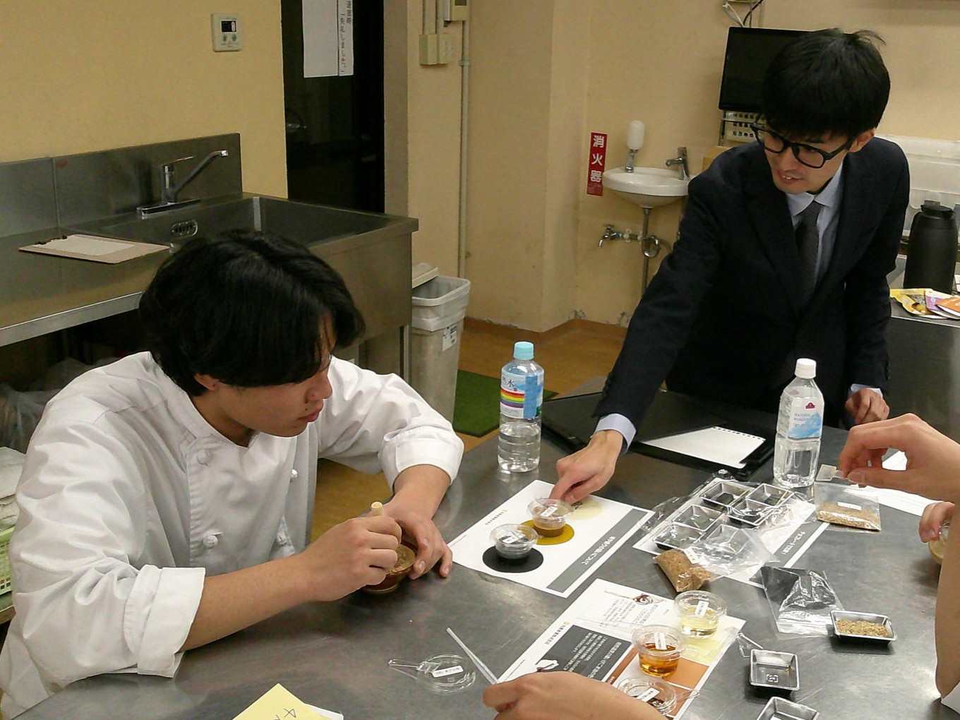 九鬼産業 株式会社 三重県の地元企業の紹介の取り組みとして 特別授業をしていただきました。 ごまといえば… 九鬼産業さん! ごまとごま製品について授業をしていただきました。 ごまについて教わり、 実際にごまをすり鉢ですると、するごとに香りが豊かになり実習室にごまの香りが充満!練りごまを目指して一生懸命すっていました。 黒ごまラテの試飲やごま製品を使ったチョコレートを試食させていただき、ごまの可能性や素材の活かし方を学びました。 ありがとうございました。
