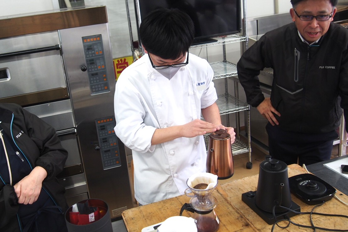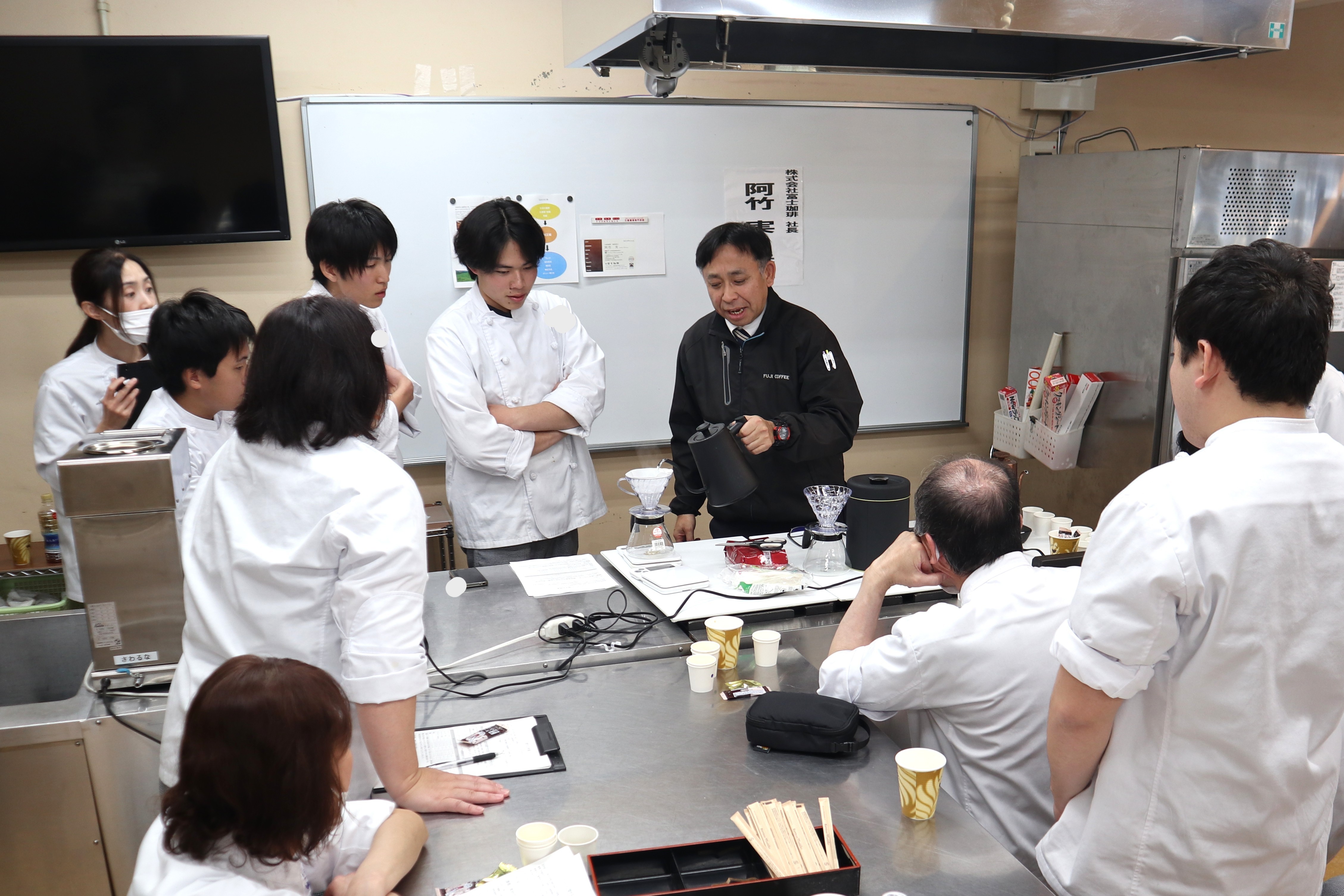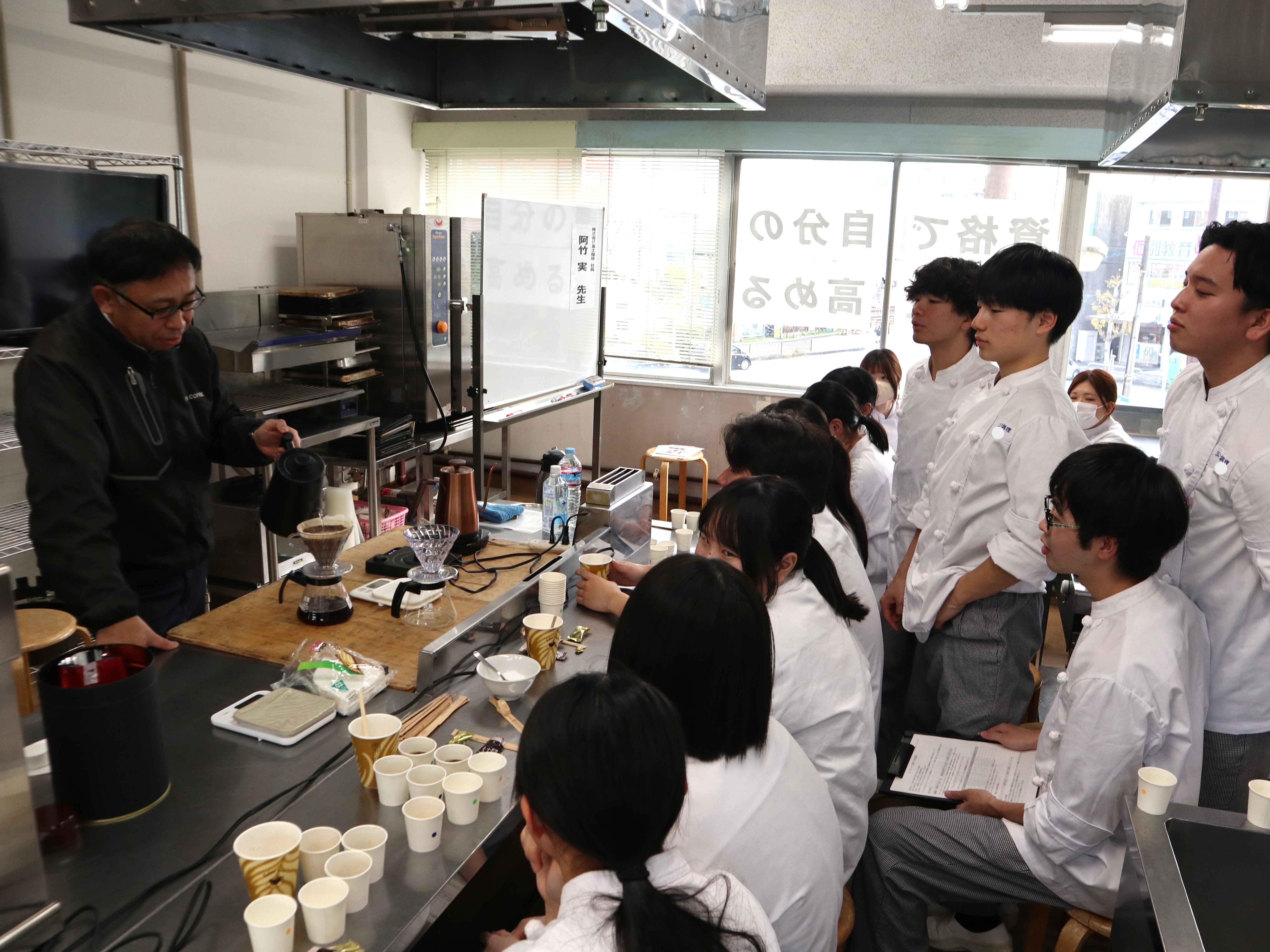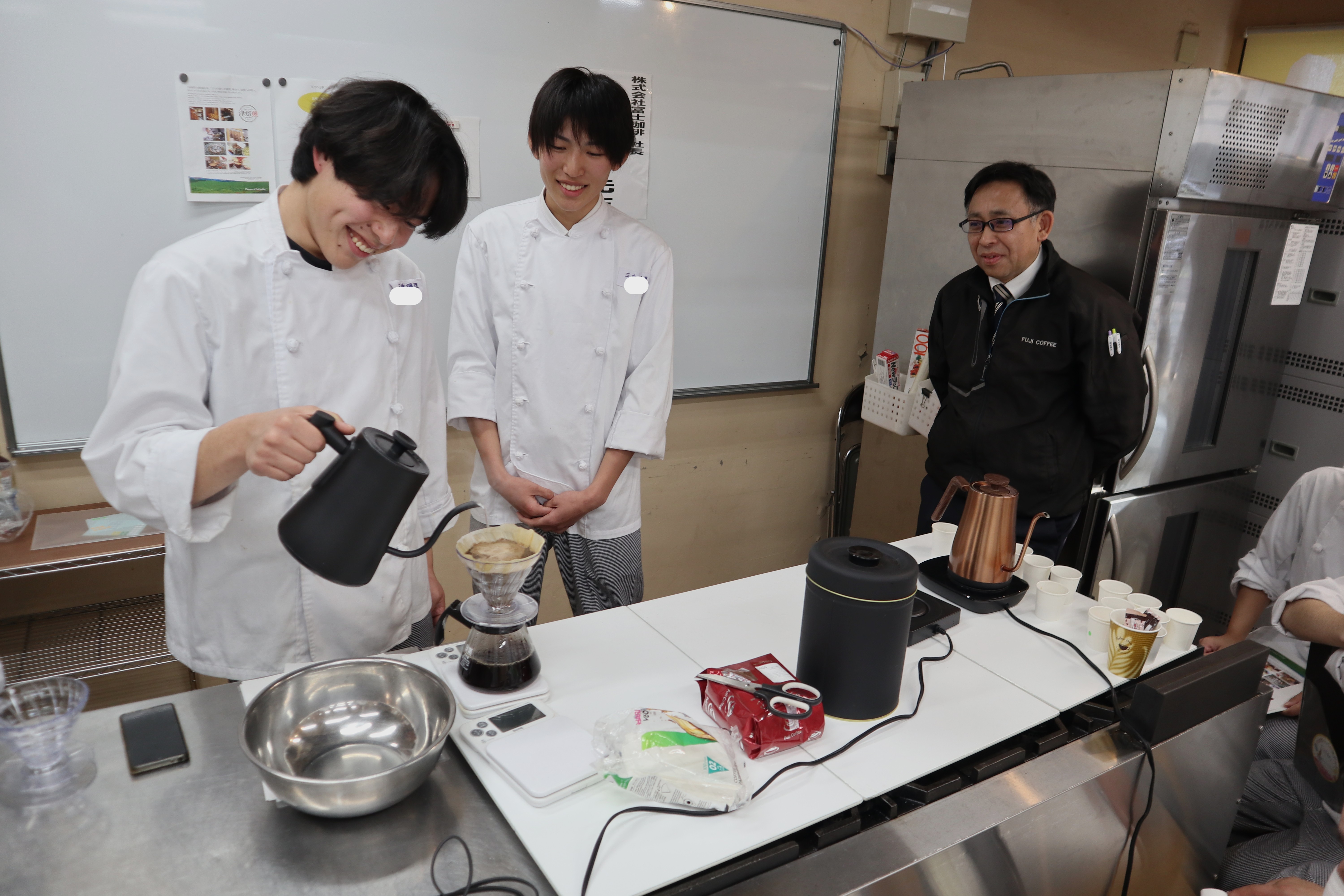 株式会社富士珈琲の阿竹社長にお越しいただき、コーヒーについての授業を実施! 今ではいろいろな飲食店で飲めるコーヒー。 複数のコーヒーを飲み比べて風味の感想を発表しあい、ハンドドリップも実践しました☆ 初めてのハンドドリップ、上手にできたかな?