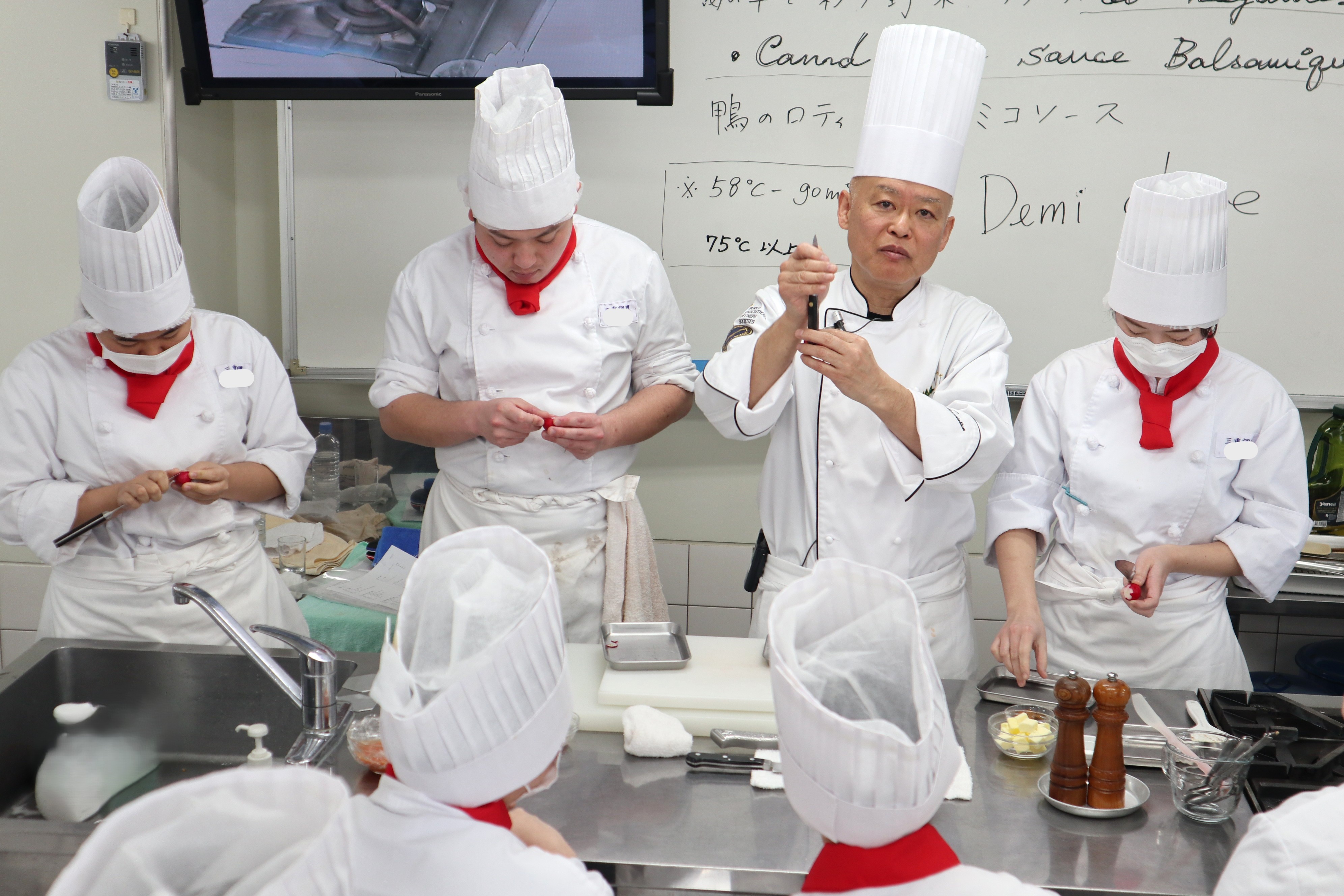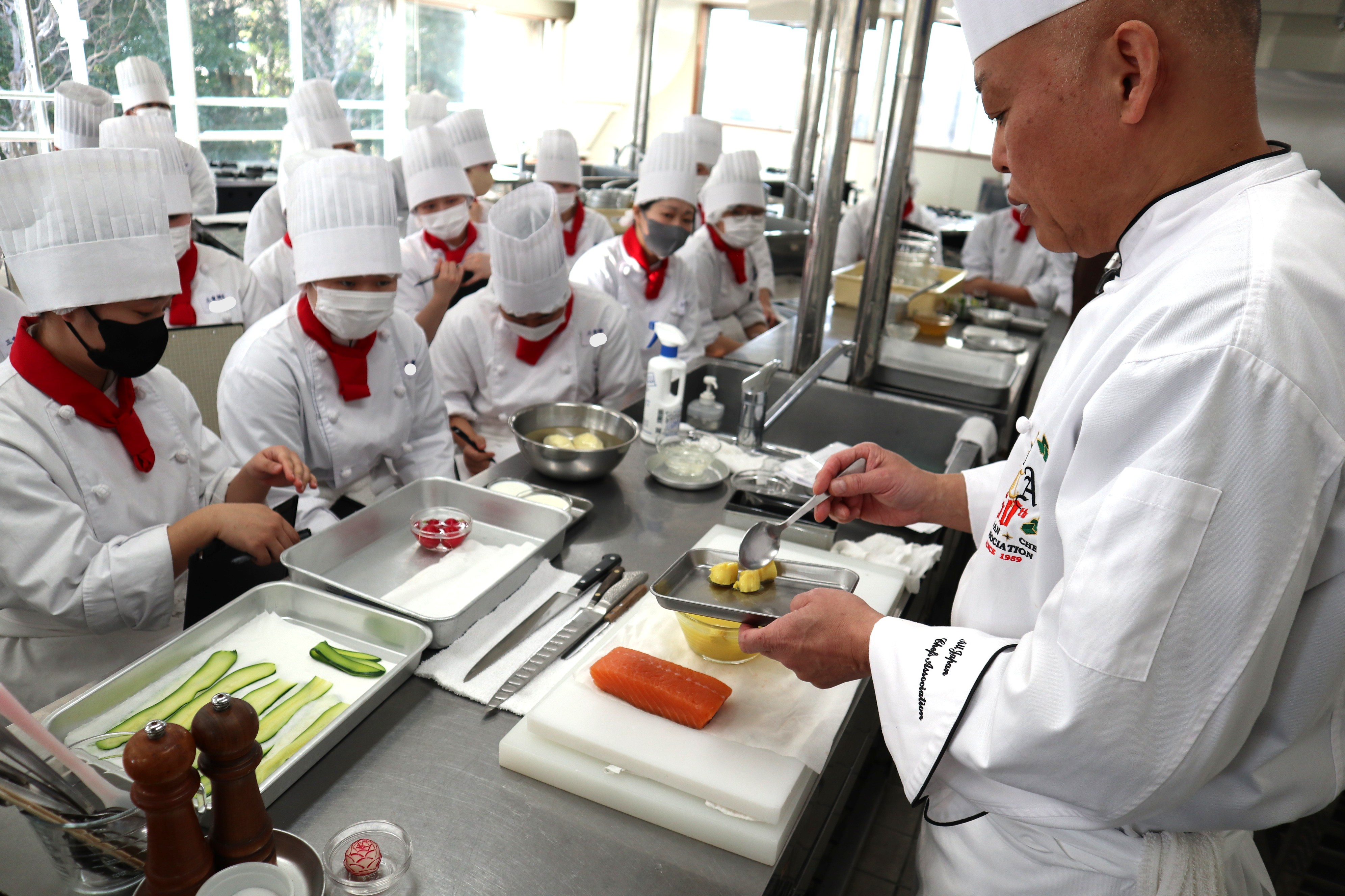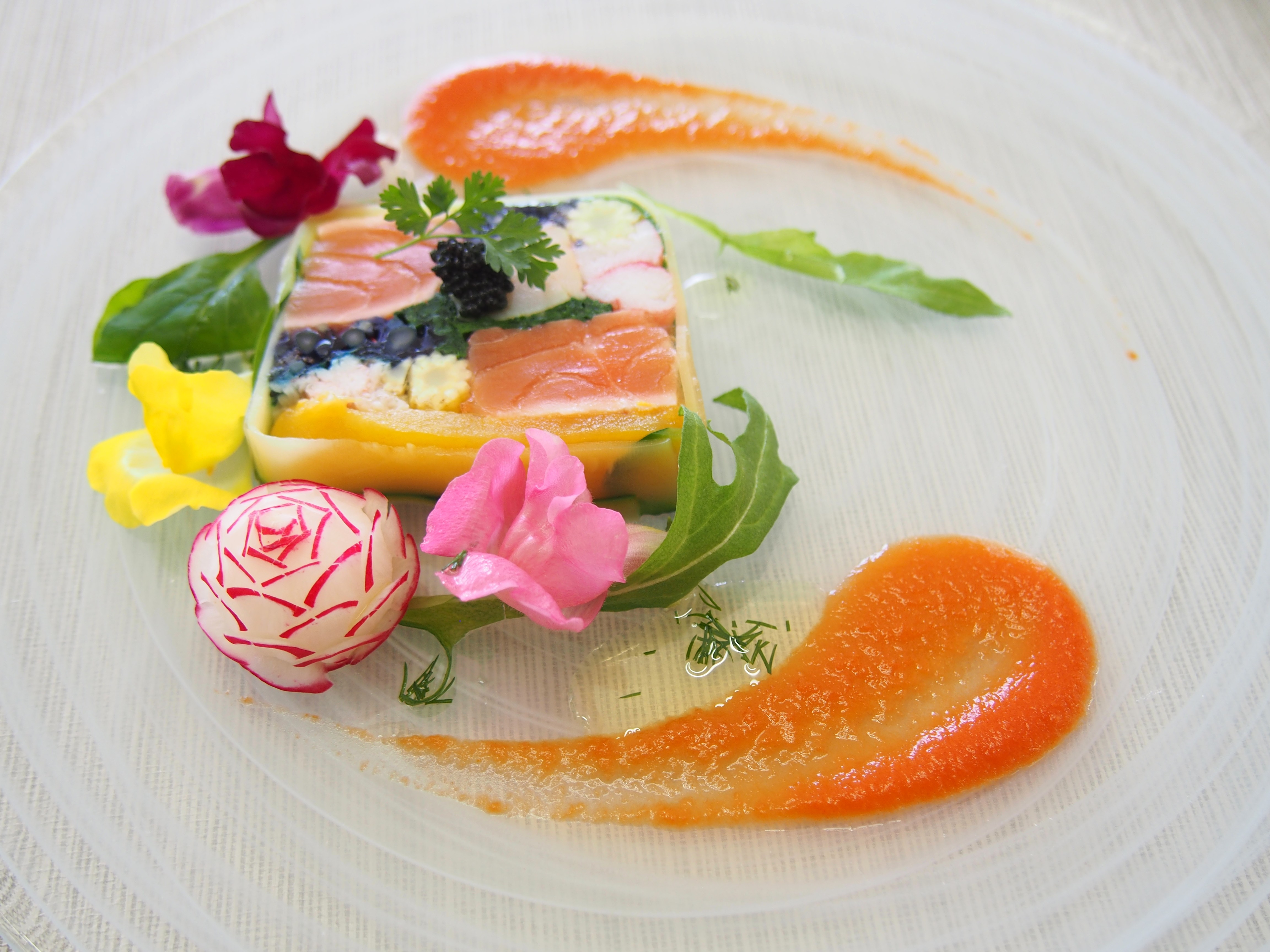 西洋特別実習で本校の卒業生である加藤 一秀先生にお越しいただきました。 今回は婚礼料理を教えていただきました! お祝い事の料理とあって、ラディッシュの飾り切りや食用花を使用して華やかに仕上がりました♪ メニュー ・海の幸と彩り野菜のテリーヌ仕立て Terrine de fruits de mer et le’gumes ・鴨のロティ バルサミコソース Canrd rôti sauce balsamique
