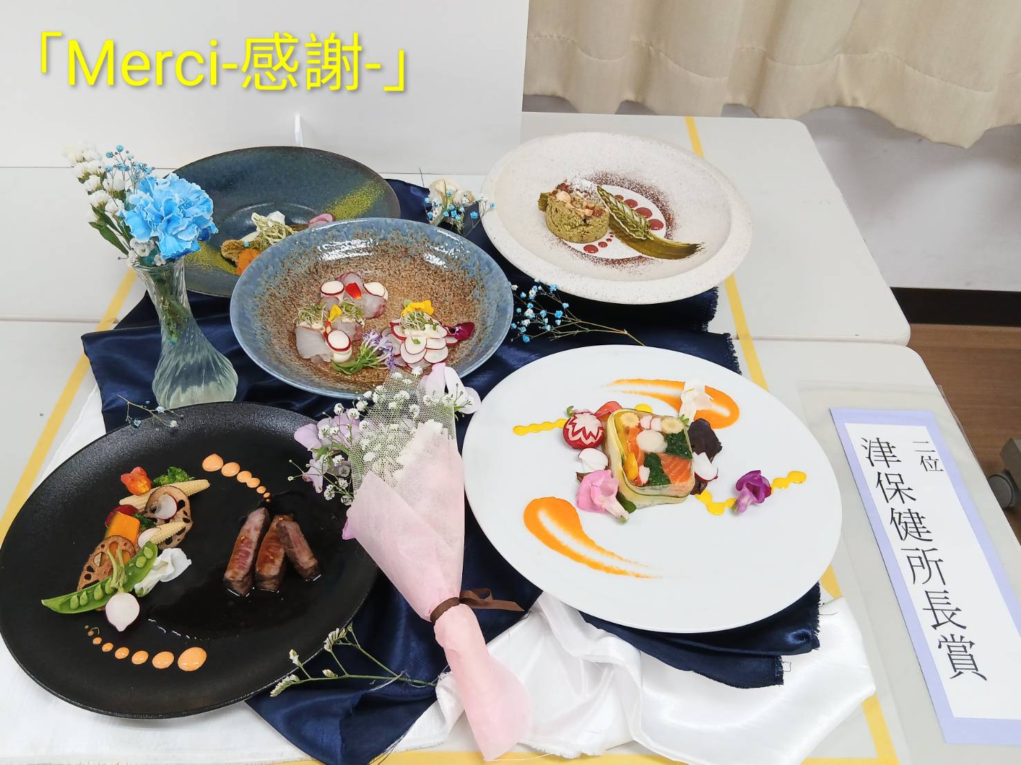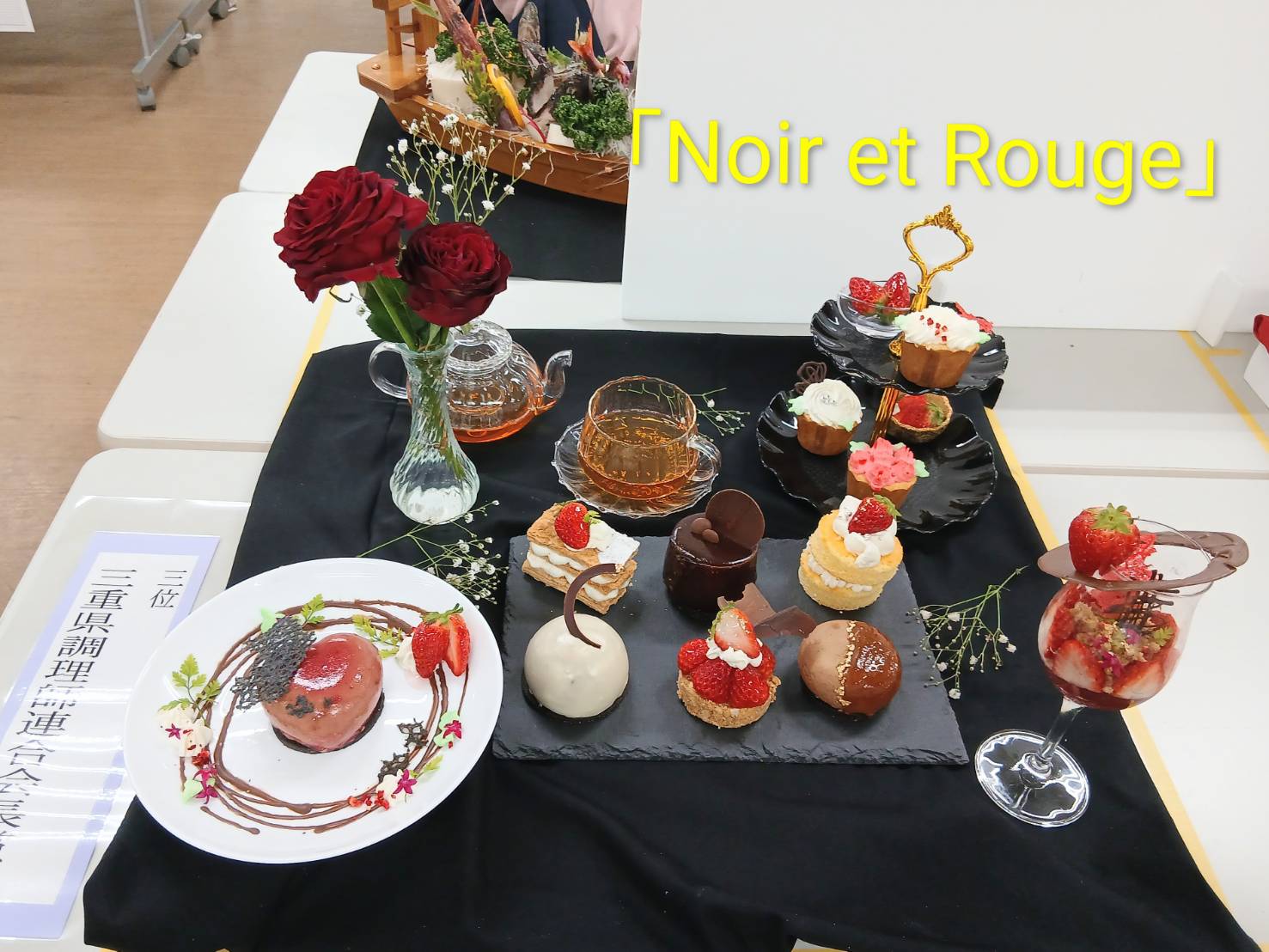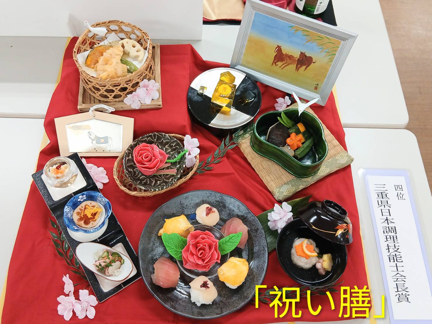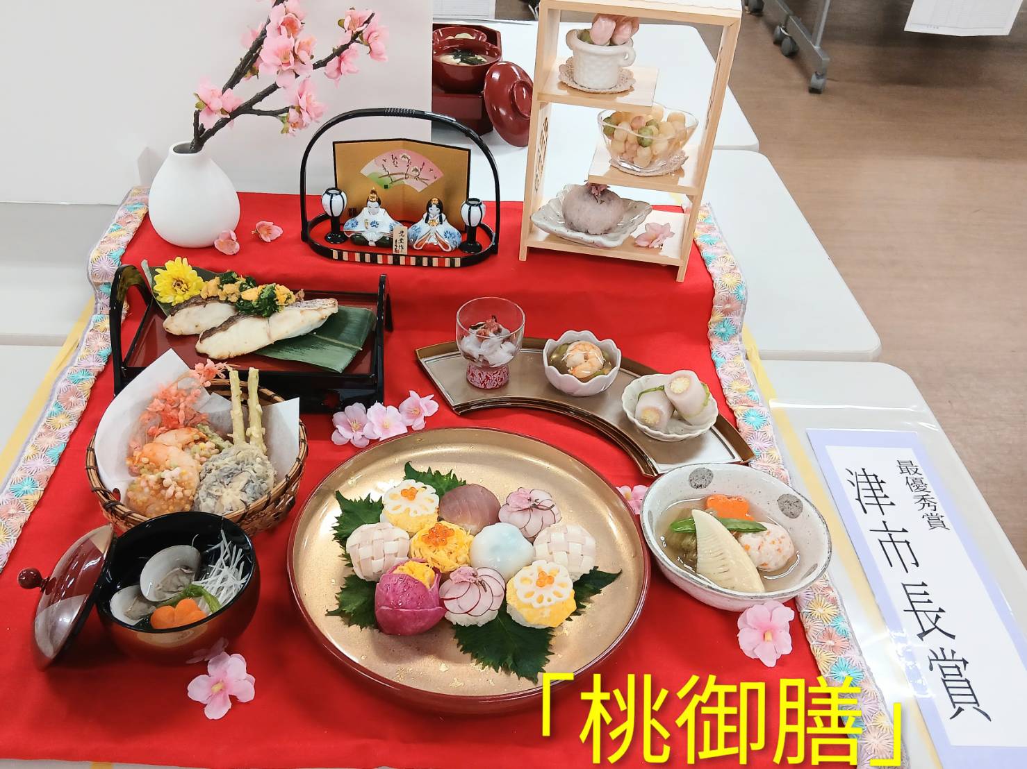 料理作品展の受賞作品1位~4位をご紹介♪ 1位 津市長賞 「桃御膳」 2位 三重県津保険所長賞 「Merci-感謝-」 3位 三重県調理師連合会長賞 「Noir et Rouge」 4位 三重県日本調理技能士会賞 「祝い膳」