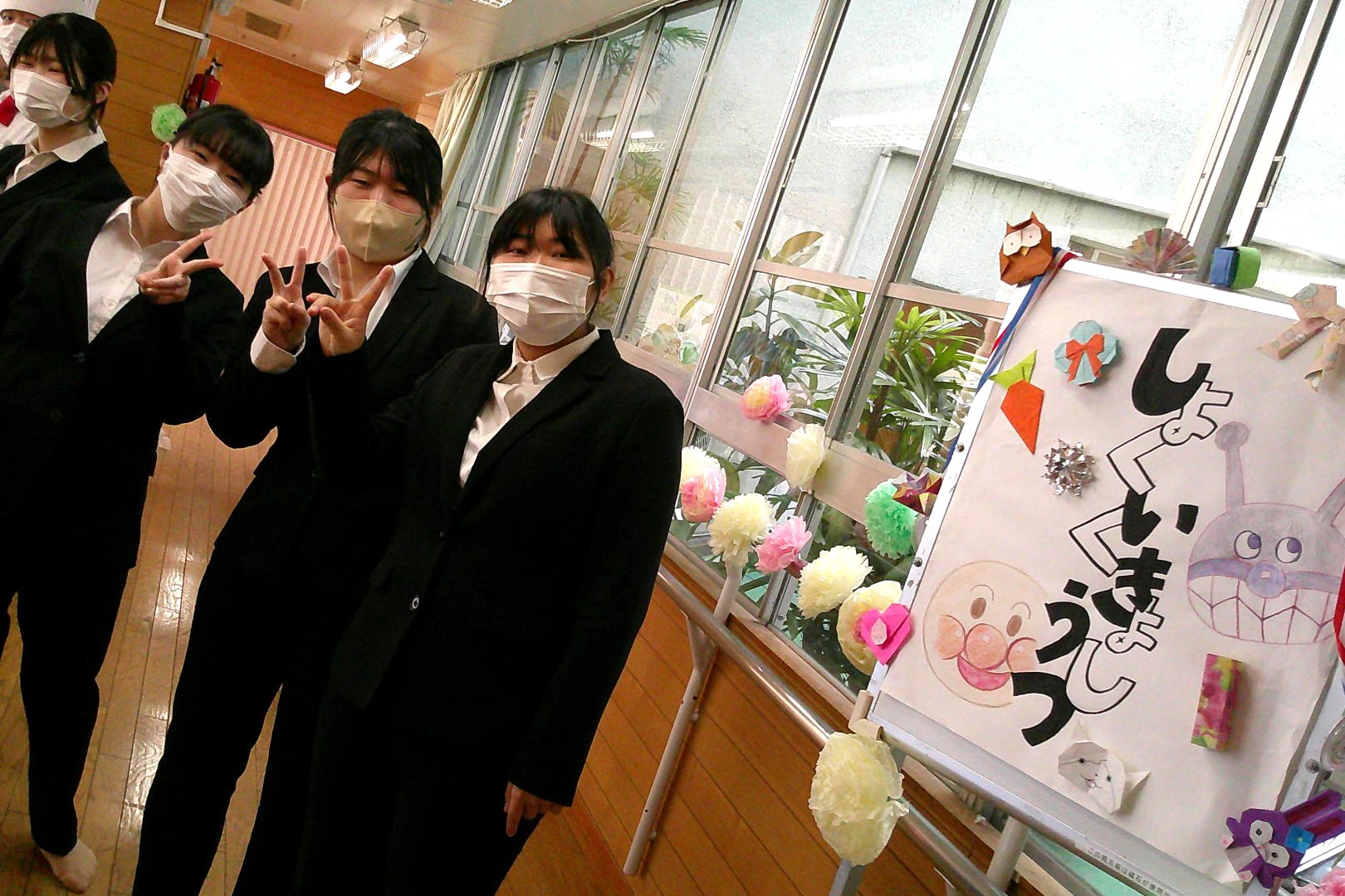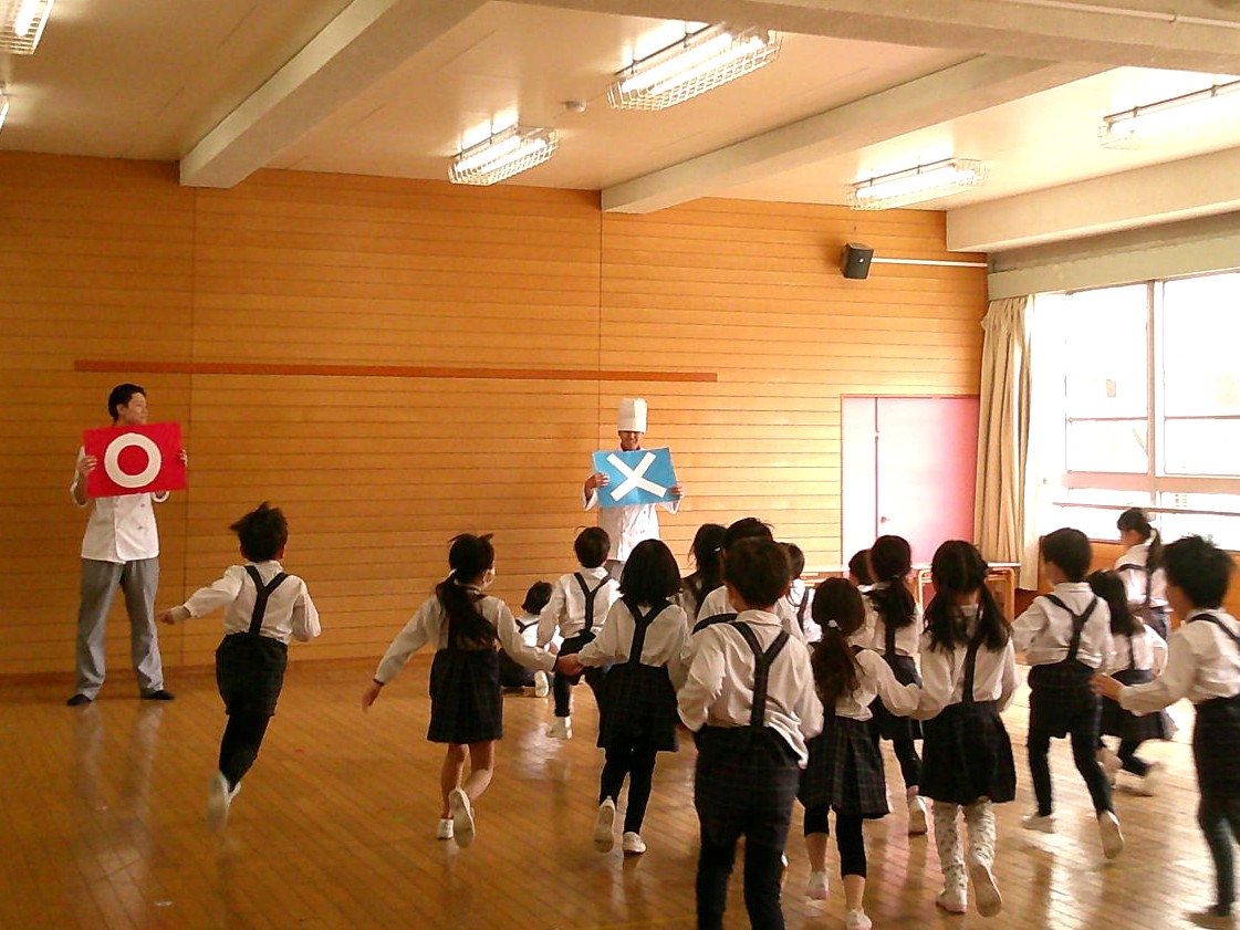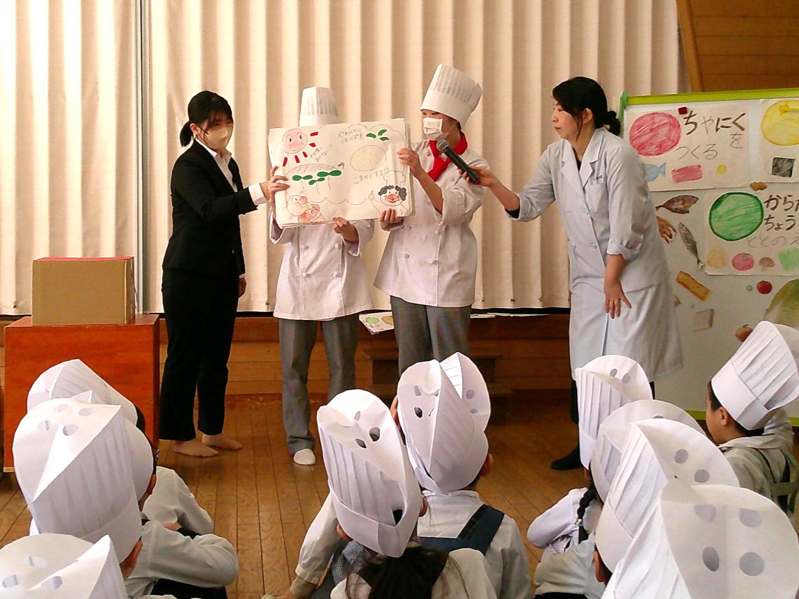 大川幼稚園の園児に食育教室を実施♪ 食育教室では、食べ物についてのクイズや紙芝居でお茶の作法を学んでもらい、実際に学生の点てた抹茶をお菓子と一緒に食べてもらいました。 最後は学生たちが園児のために一生懸命作ったメダルや折り紙をプレゼント‼ 園児たちの笑顔に学生たちもすごく嬉しそうでした☆